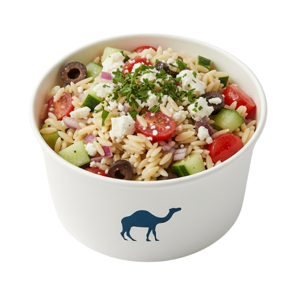 Perfectly prepared pasta tossed with fresh green and red peppers black olives, onion, and garlic, in a light and zesty vinaigrette.
